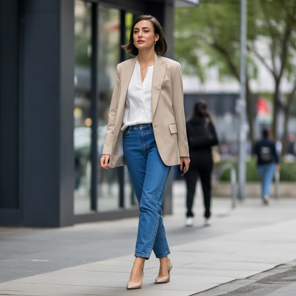 A structured blazer paired with straight-leg jeans is the definition of modern chic. It’s simple, classy, and works for almost any casual occasion. Add a white top and neutral heels to keep it clean and polished.