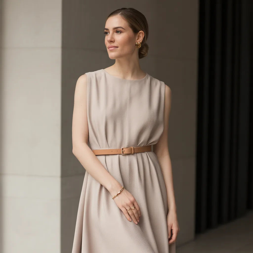 A midi dress instantly gives feminine energy. Adding a slim belt defines the waist and makes the outfit feel more structured. Choose soft neutral tones for a refined, graceful vibe.