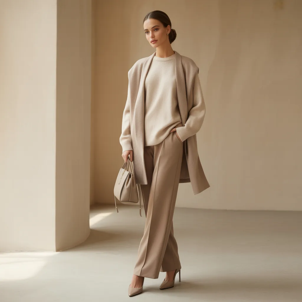 This look is pure elegance. Wearing one shade from head to toe, especially beige or cream, creates a soft, expensive appearance. A beige blouse with matching tailored trousers and nude heels feels calm, confident, and effortlessly classy.