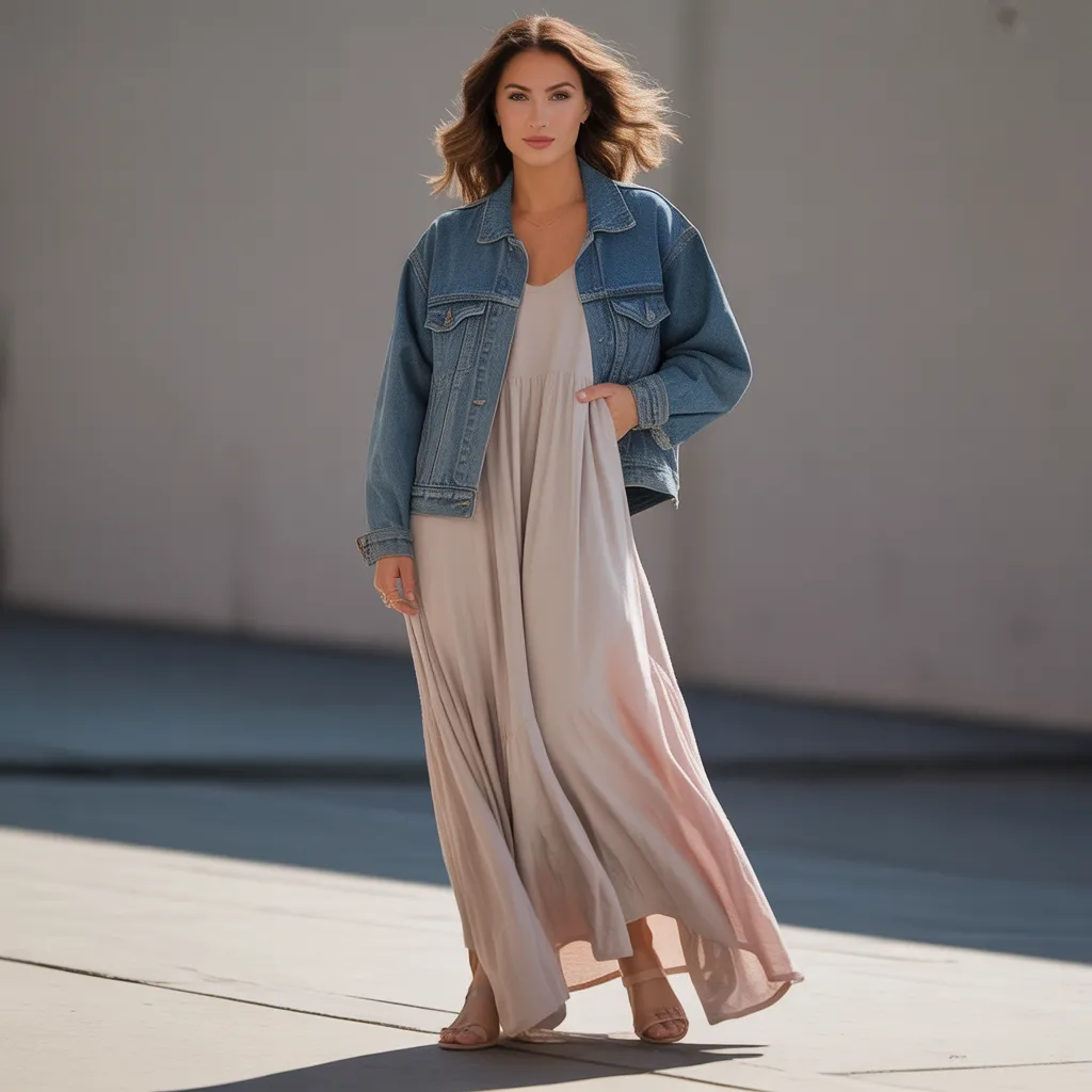 This is one of those outfits you’ll want to repeat every season. A flowy maxi dress layered with a light denim jacket blends comfort and chic perfectly. It feels feminine, relaxed, and stylish at the same time.
