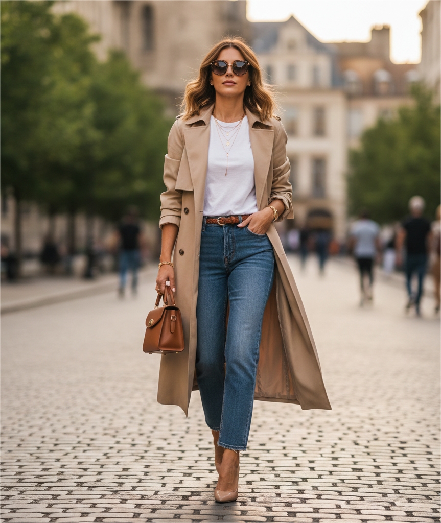 A trench coat instantly upgrades even the simplest outfit. Wear it over jeans and a basic top for that timeless, Parisian-inspired chic vibe.
